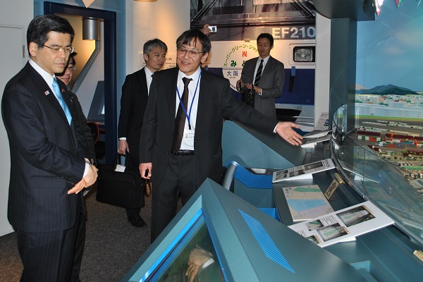 TOKYOミナトリエで東京港の歴史について説明を受ける石井大臣