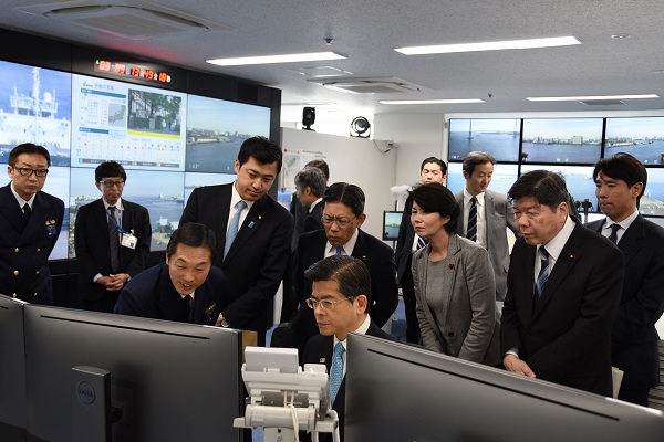 東京湾海上交通センターで管制業務の説明を受ける石井大臣
