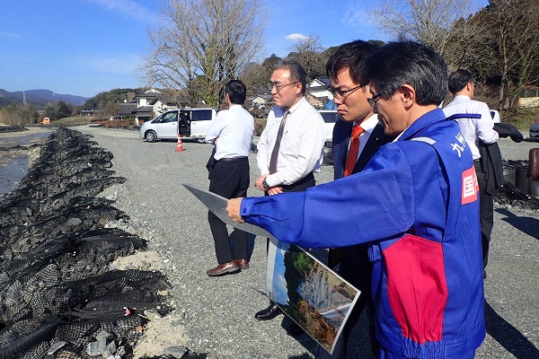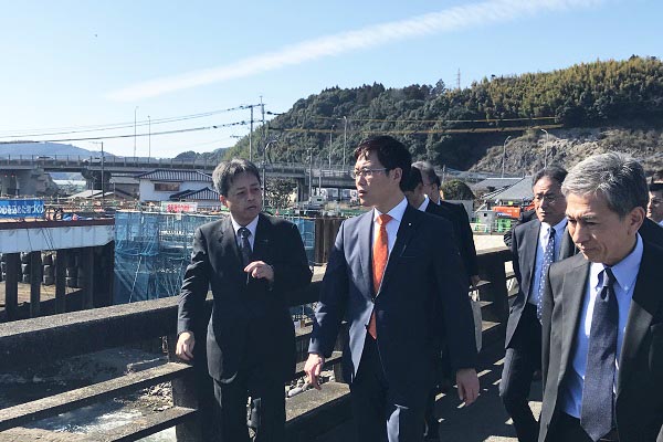 JR九州の久大線花月川橋りょうの復旧状況について説明を受ける秋本政務官