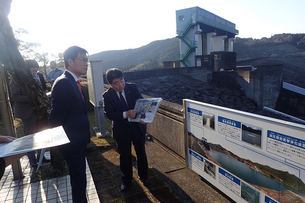 寺内ダムの被害防止・軽減効果について説明を受ける秋本政務官