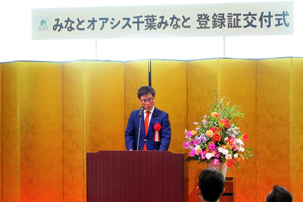 「みなとオアシス千葉みなと」登録証交付式で挨拶をする秋本政務官