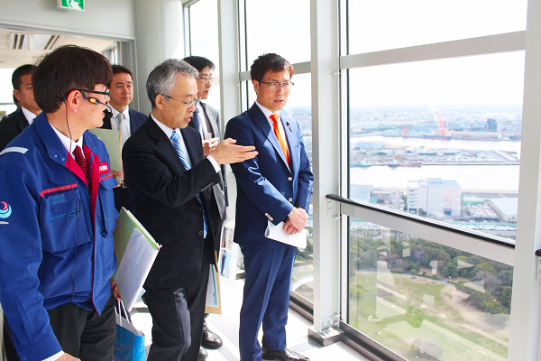 葉ポートタワーより、千葉港全域を視察する秋本政務官