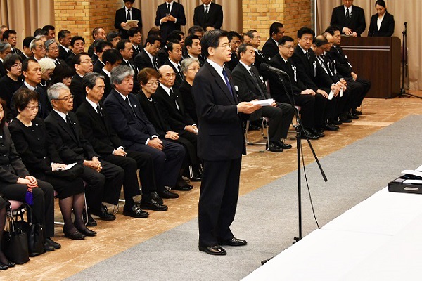 熊本地震犠牲者追悼式で挨拶する石井大臣(熊本県提供)
