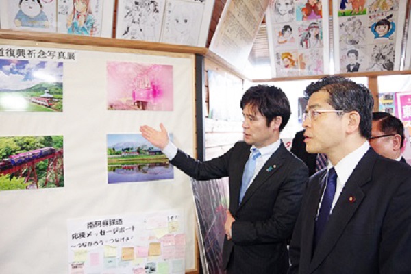 高森駅で南阿蘇鉄道について説明を受ける石井大臣