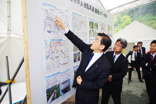 九州横断自動車道(延岡線)嘉島JCT~矢部の工事進捗状況について説明を受ける石井大臣