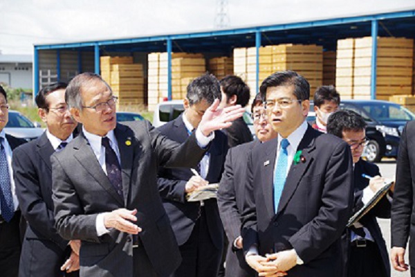 細島港において新規立地した木材工場内を視察する石井大臣