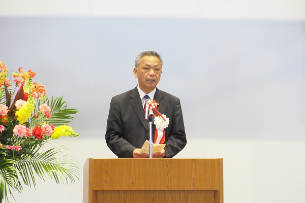 完成式典で挨拶をする高橋政務官