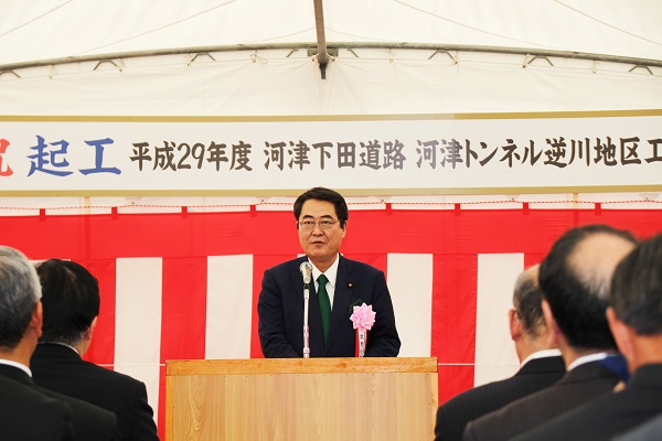 牧野副大臣は、式典において「河津下田道路(2)期)に並行する国道414号は、観光シーズンである夏に、観光バス等の大型車が通行止めになること等が大きな課題となっています。河津トンネルの着工は、課題解消に向けた大きな一歩となります。国土交通省としては、河津下田道路(2)期)の整備に全力で取り組んで参ります。」と挨拶しました。