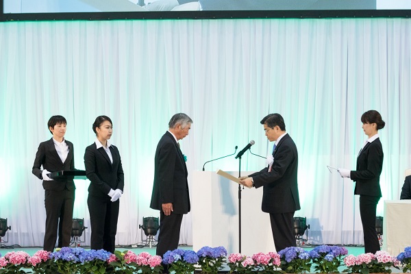同式典において、第29回「みどりの愛護」功労者国土交通大臣表彰の表彰式が行われ、受賞された106団体の代表に対し、石井大臣から感謝状が授与されました。