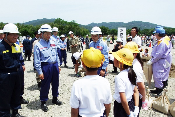 演習には国土交通省のほか、岐阜県、愛知県、三重県、岐阜市、水防団、警察、自衛隊などに加え、地元企業、学校などの多様な機関が参加し、決壊しそうな堤防を守るための水防工法訓練、地域住民避難のための情報伝達訓練、避難訓練、人命救助訓練などを中心に、予め決められたタイムラインに沿った、より実践的な訓練を実施しました。