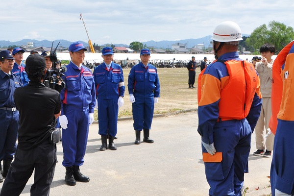 水防団を激励する秋本政務官