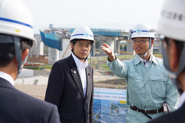 犀川遊水地事業の進捗状況について説明を受ける石井大臣