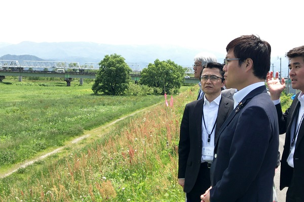 秋本政務官は、山形県最上川流域を訪れ、「最上川官民連携プラットフォーム(※)」において検討されている河道内樹木伐採に関する先進的取組みを視察しました。