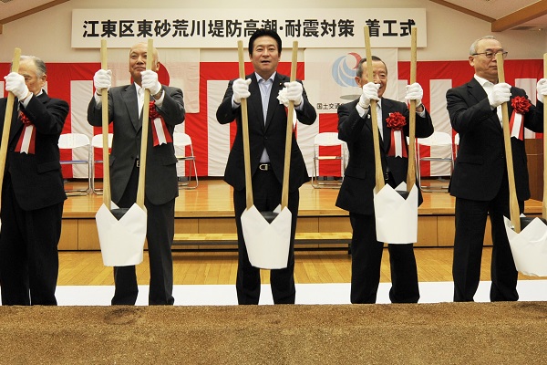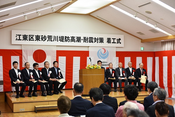 首都圏を貫流する荒川下流部の東京都江東区東砂地区における堤防の高潮・耐震対策の着工式が、6月10日、江東区長や地元町会長をはじめ多くの関係者(来賓)の出席の下、江東区内で開催され、あきもと副大臣が出席しました。