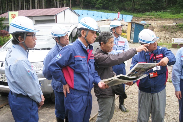 芹沢地区被災当時の自治会長から被災状況の説明を受ける高橋政務官