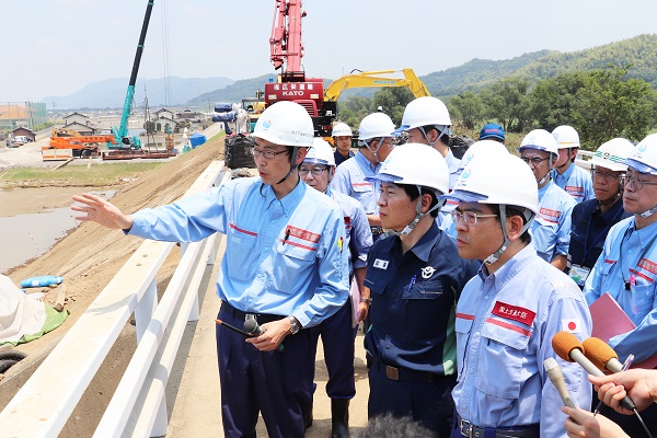倉敷市真備町の小田川被災箇所を視察する石井大臣