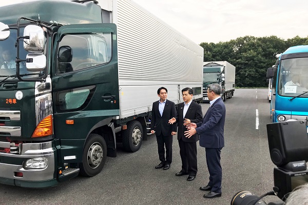 後続無人隊列走行トラックについて説明を受ける石井大臣
