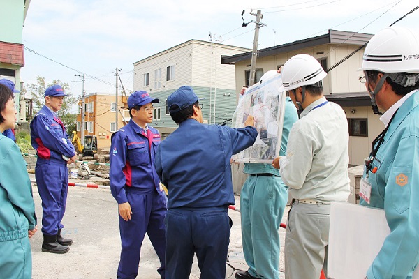 札幌市清田区里塚の地盤液状化箇所で説明を受ける石井大臣