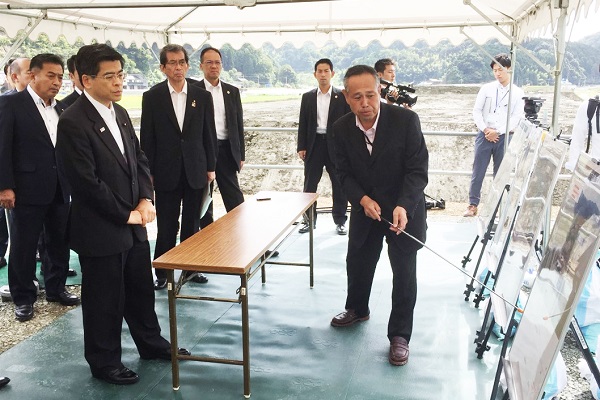 由良川(福知山市戸田地区)の堤防の整備状況について説明を受ける石井大臣