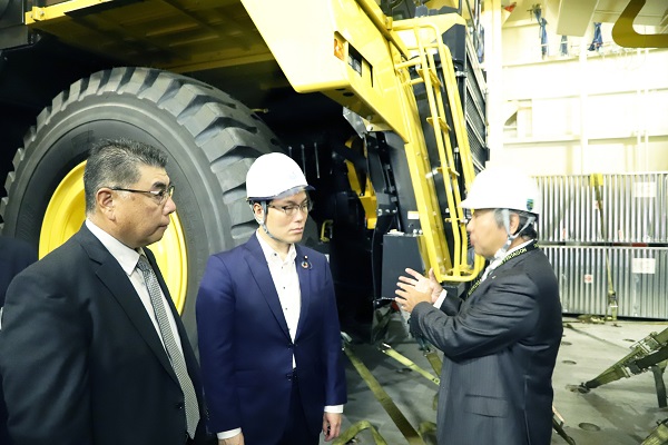 自動車運搬船内で建設機械の荷役状況を視察する秋本政務官