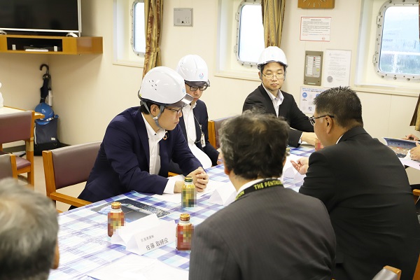 船内の士官食堂で説明を受ける秋本政務官