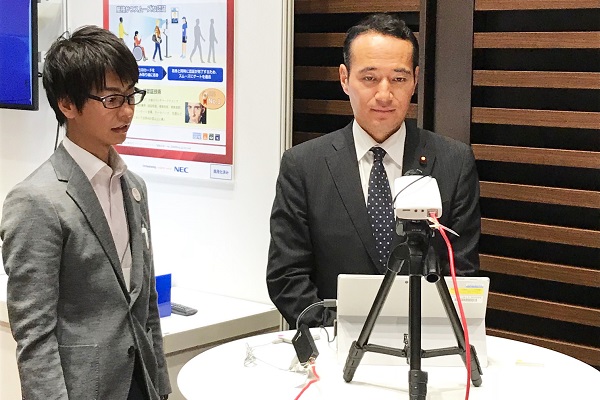 顔認証システムについて説明を受ける簗政務官