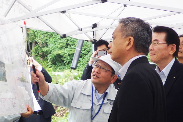 会津縦貫南道路(小沼崎バイパス)整備状況について説明を受ける高橋政務官