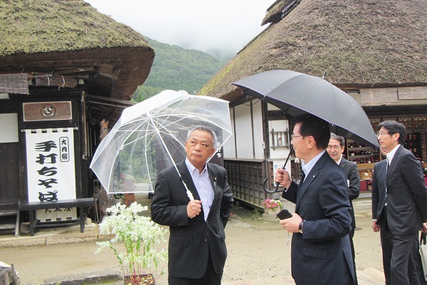 大内宿にて下郷町長から無電柱化の説明を受ける高橋政務官