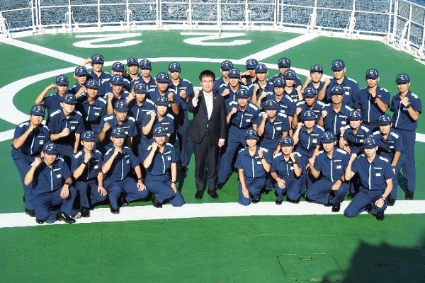 海上保安学校の練習船「みうら」にて実習中の学生を激励する秋本政務官