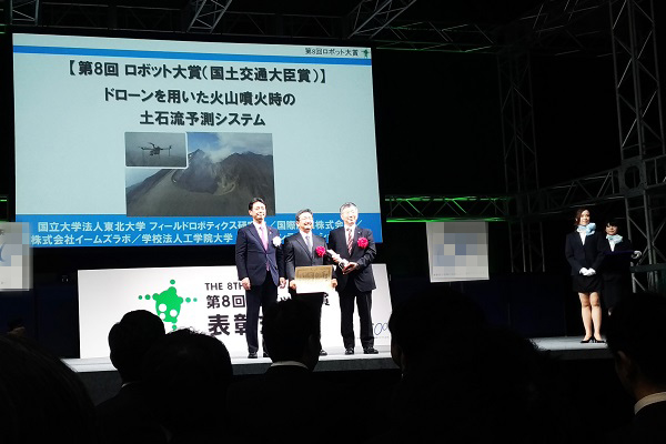 工藤政務官は、国土交通大臣賞を受賞した「ドローンを用いた火山噴火時の土石流予測システム(国立大学法人東北大学 フィールドロボティクス研究室/国際航業株式会社/株式会社イームズラボ/学校法人工学院大学 システムインテグレーション研究室)」に表彰状を授与しました。