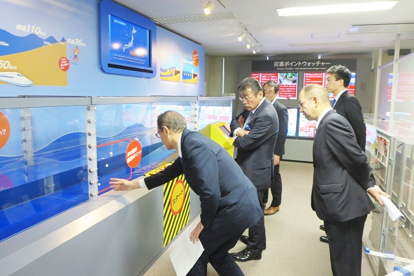 地震や火山を監視し警報等を発表している地震火山現業室や、気象の警報・注意報や天気予報を作成・発表している予報現業室などを視察し、その後、気象科学館において、観測機器や装置、緊急地震速報、津波の仕組みなどについて説明を受けました。