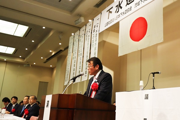 来賓として挨拶した大塚副大臣は、「人口減少等に伴う厳しい経営環境、執行体制の脆弱化、施設の老朽化などの課題が一層進んでいる中、下水道の持続性向上のためにも、国土交通省として下水道予算の確保も含め努力をして参ります。」と述べました。