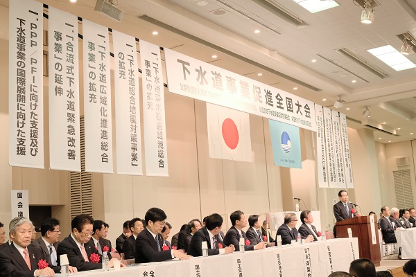 11月5日(月)、都内で「下水道事業促進全国大会」(主催:日本下水道協会、全国町村下水道推進協議会、流域下水道都道府県協議会、全国流域下水道促進協議会連合会)が開催され、大塚副大臣、工藤政務官、田中政務官、阿達政務官が出席しました。