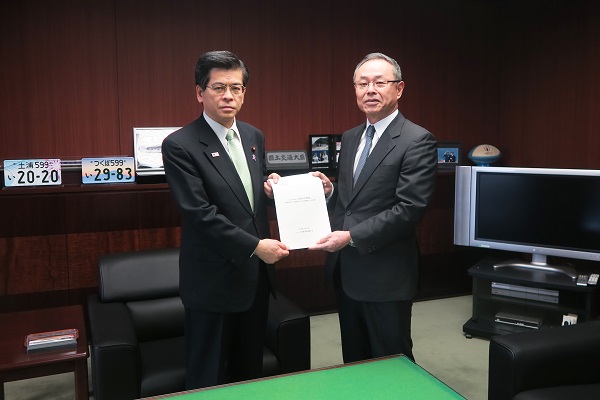 Society5.0時代の物流の将来像と、その実現に向けた施策に関して、一般社団法人日本経済団体連合会(経団連)においてとりまとめられた提言「Society5.0時代の物流」が、経団連の武藤光一運輸委員長から石井大臣に対して手交されました。