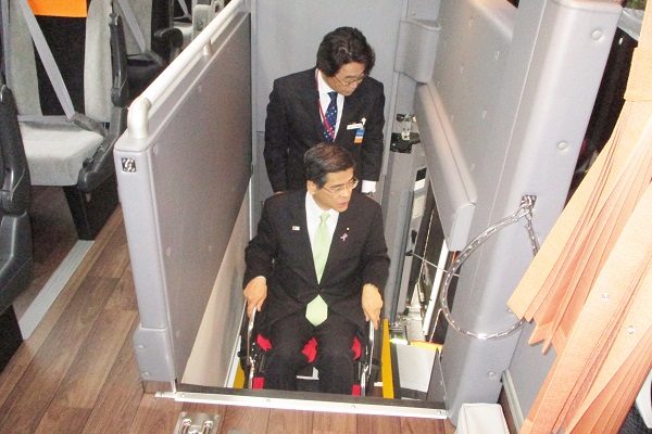 エレベーター付リムジンバスに車椅子で乗車体験する石井大臣