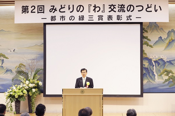 石井大臣は「本日の受賞者の皆様の取り組みは、「みどりの『わ』」を全国に広げる原動力となるものであり、その業績に対し深く敬意を表する」と祝辞を述べました。