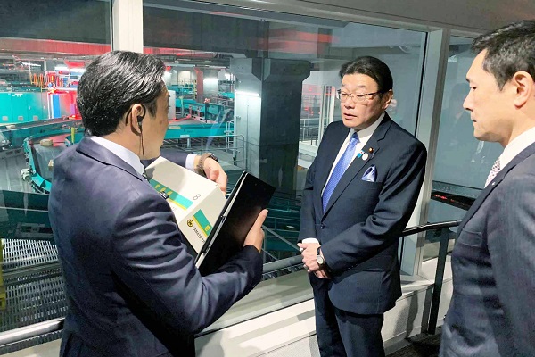 自動仕分けの仕組みについて説明を受ける大塚副大臣