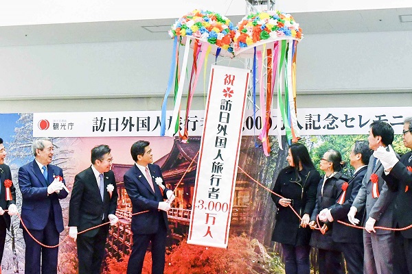 くす玉で訪日外国人旅行者数3000万人到達を祝福