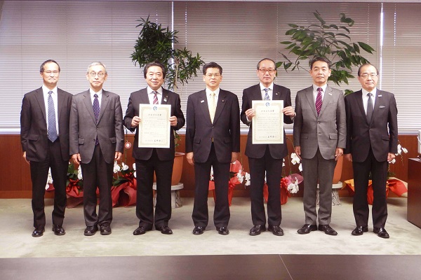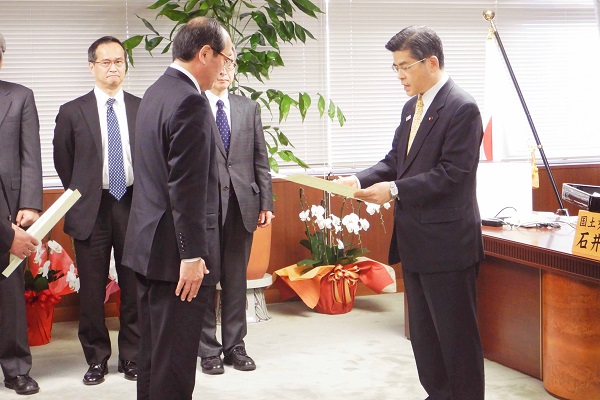 【平成30年12月20日】 山形県長井市長、広島県広島市長へ「かわまち大賞」を石井大臣が授与