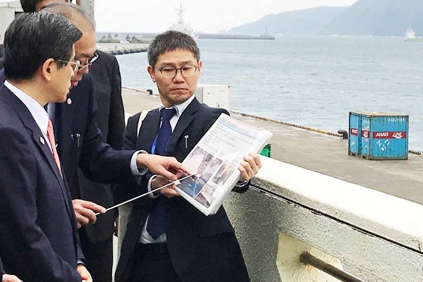 名瀬港(本港地区)の整備状況について説明を受ける石井大臣