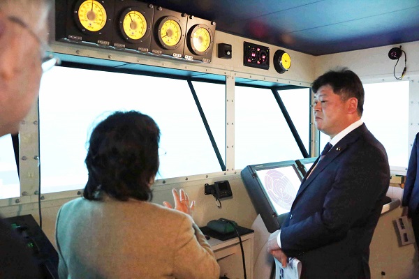 海事分野(海上技術安全研究所)では、船舶の環境対応技術の研究開発に利用する舶用エンジン、海難事故時の状況の模擬等に用いる操船リスクシミュレータ、実際の海域で発生する波の状況を再現する実海域再現水槽などを視察しました。
