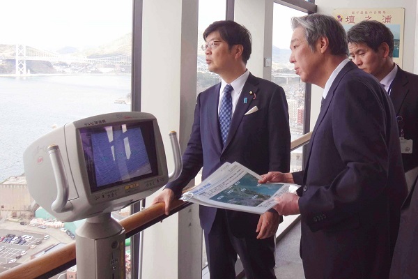 関門航路及び門司港レトロ地区について説明を受ける阿達政務官