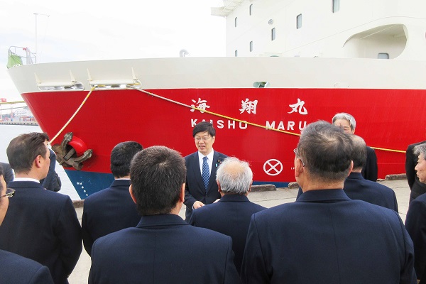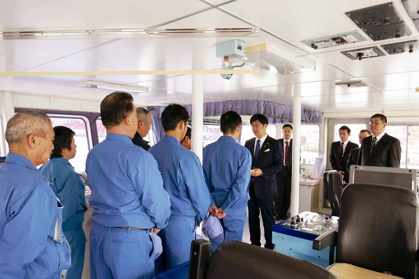 大型浚渫兼油回収船「海翔丸」の船員を激励する阿達政務官
