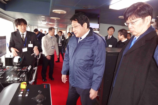大型浚渫兼油回収船「白山」を視察する塚田副大臣、阿達政務官