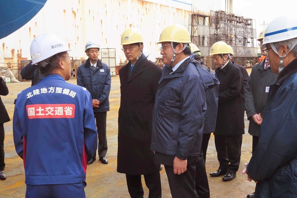 【平成31年2月5日】 SEP型多目的起重機船「CP-8001」及び造船現場を塚田副大臣、阿達政務官が視察