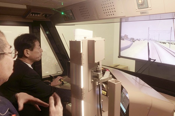 また、駅舎に隣接する中央研修センターの実習棟にて、実際の機関車を模した運転シミュレーターを体験しました。