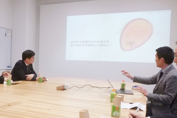 Spiber(株)で事業の概要等について説明を受ける阿達政務官