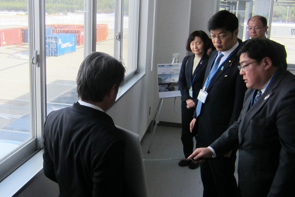 酒田港コンテナターミナルの利用状況について説明を受ける阿達政務官