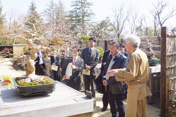 日本庭園内の盆栽苑で盆栽の伝統技術について説明を受ける大塚副大臣