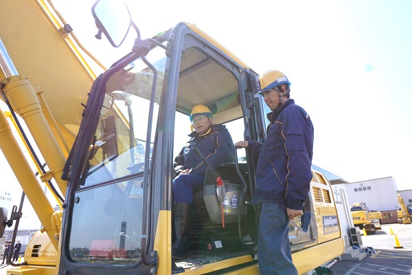 大塚副大臣は、3次元データ等を用いて自動制御を行うICT建機など、ICT施工についての説明を受けるとともに、施工の実演の視察やICT建機の試乗等を行いました。